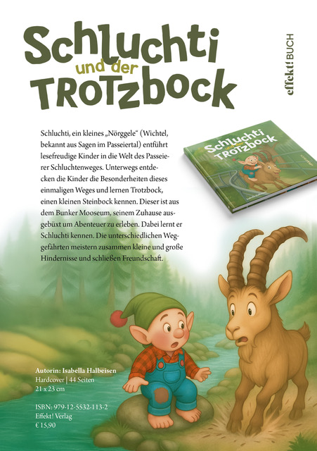Schluchti, ein kleines „Nörggele“ (Wichtel, bekannt aus Sagen im Passeiertal) entführt lesefreudige Kinder in die Welt des Passeierer Schluchtenweges.